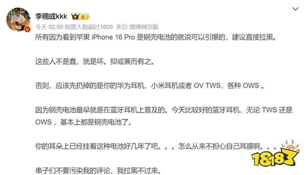 虽然苹果官方已清晰说其产品并无问题,但关于iPhone 16选用钢壳电池的传言仍继续发酵,部分网友乃至忧虑这种电池规划或许导致安全危险危险。针对这一无稽之谈,前魅族高管李楠在社会化媒体上揭露表达了自己的不满与愤恨。